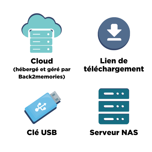 Quel que soit le format et le support d’origine, nous réalisons la numérisation de votre patrimoine d’entreprise et de votre patrimoine familial, vers le support numérique de votre choix : lien de téléchargement / Disque dur externe / Serveur NAS / Cloud (hébergé et géré par Back2memories) / Clé USB.